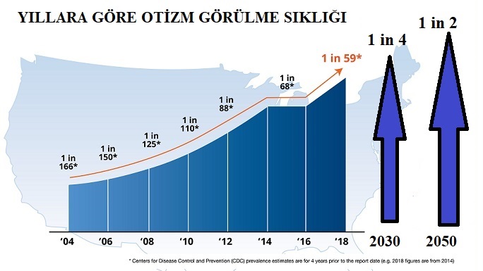 Otizm için tanı kriterlerindeki belirtiler çok fazla olduğu için görülme sıklığı da son yıllarda inanılmaz artmıştır. 2018 yılında yapılan araştırmaya göre her 59 çocuktan birine otizm tanısı konulmaktadır. Verilerin artış hızı dikkate alındığında 2030 yılında her 4 çocuktan birine, 2050 yılında ise her 2 çocuktan birine otizm tanısı konulması öngörülmektedir.